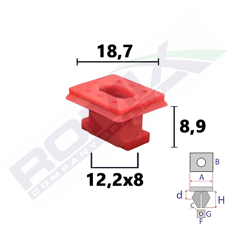 Dimensions: A 18,7 B 16,4 C 9,1x5 F 12,2 G 8 H 8,9