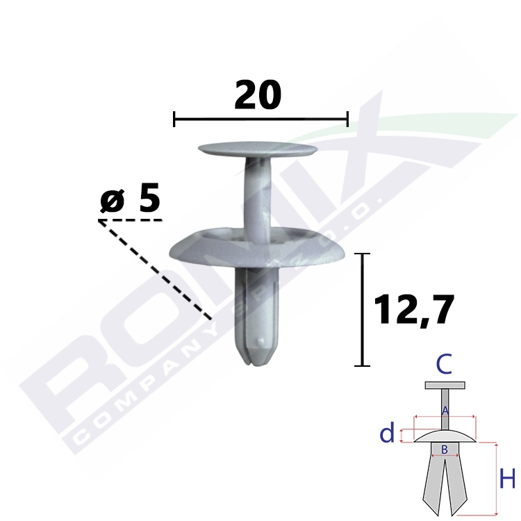 Dimensions: A 20 B 5 C 13,5 d 2,4 H 12,7 w otwór ø 5