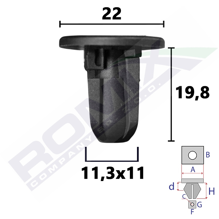 Dimensions: A 22 C 5,6 F 11,3 G 11 H 19,8
