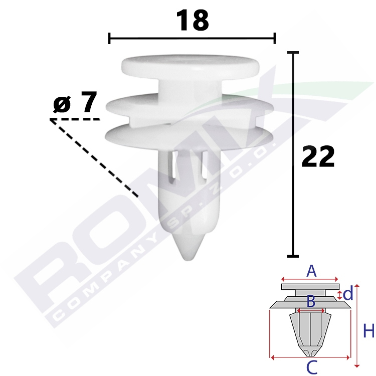 A 14,7 B 6,6 C 18 d 2,7 H 22 w otwór ø 7