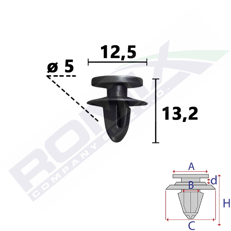 A 10,7 B 5 C 12,5 d 2,6 H 13,2 w otwór ø 5