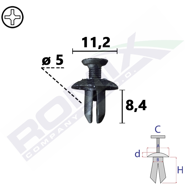 Wymiary: A 11,2 B 4,8 C 6,4 d 1,9 H 8,4 w otwór ø 5